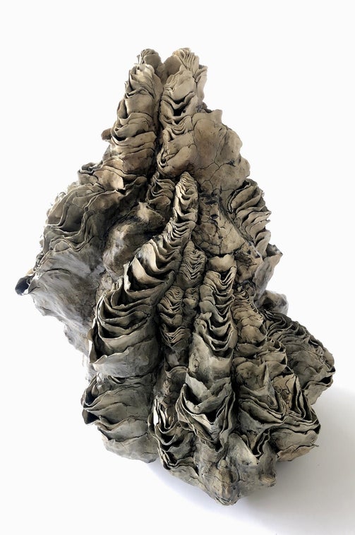 Born in 1992 in Aichi, Mio Yanaguchi belongs to the younger generation of female ceramicists. She studied art education at the Aichi University of Education after which she received further training at the Tajimi City Pottery Design and Technical Center. Her work shows her fascination with nature, especially the way repetition and clusters of elements can be found in natural designs such as beehives and corals. She does not imitate these, but draws strong inspiration from them. Mio Yanaguchi's sculptures are reminiscent of rock formations made of slate, with its repetitive layering of clay-rich sediments, such as clay shale. that have been transformed under high pressure over countless centuries. Each layer can be as thin as a sheet of paper, just as Mio Taniguchi's sculptures are composed of countless thin layers. For her, applying each layer one by one is a form of meditation. When she works on her objects, she feels at one with the material, and the final sculpture seems to be the result of this meditative state of consciousness. It also invites the viewer to a moment of reflection and meditation, as one does in "suiseki," the Japanese art of appreciating the beauty of a stone as it has been shaped by elements over centuries, with explicit appreciation for aspects such as stability, longevity and immortality. And Mio Yanaguchi herself also experiences her objects as such, when she sees the fingerprints in the surface and can see the traces of her existence in the clay because, as she herself says, her thoughts and emotions are absorbed into the clay and recorded in the object. Despite her still young age, Mio Yanaguchi has already received much appreciation for her sculptures. She was selected to exhibit at the 3rd KOGEI Triennial in Kanazawa, Ishikawa, the Hagi Grand Prix IV at the Hagi Uragami Museum and the 50th Women's Association of Ceramic Art Exhibition and the 11th International Ceramics Competition Mino, Gifu. Renowned galleries such as the Sokyo Gallery, Kyoto and Gallery SUKI, Aichi have also presented her beautiful works.