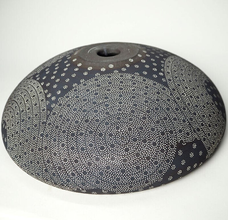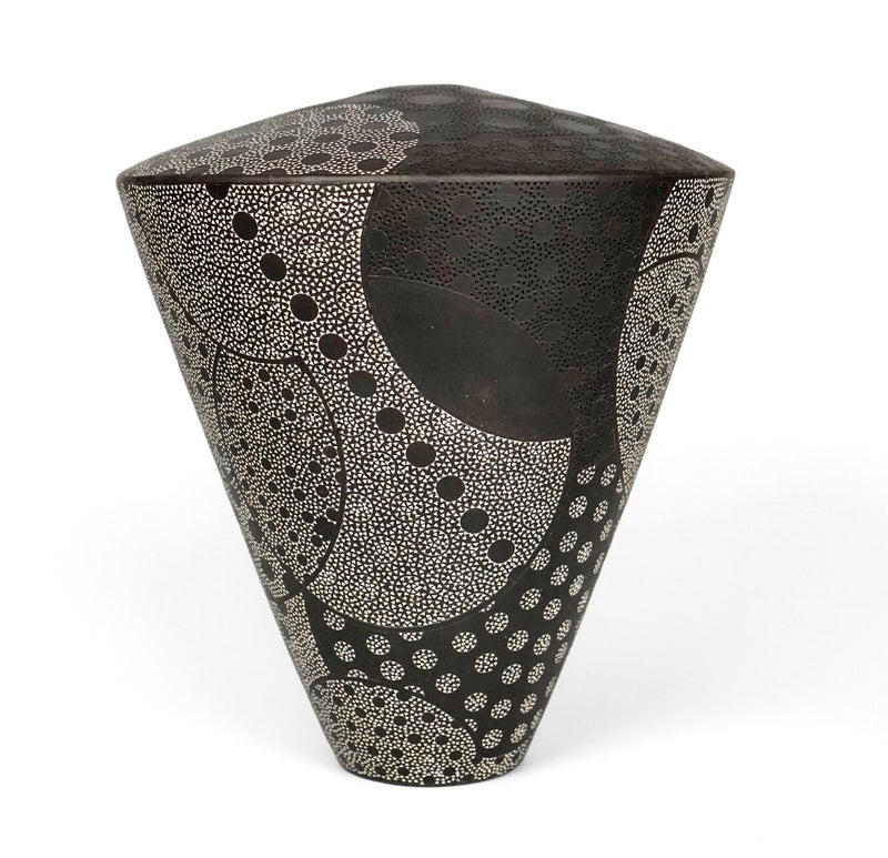 Kitamura Junko was born in Kyoto in 1956. She studied at Kyoto City University of Art, where she was taught by Suzuki Osamu, one of the founders of the influential avant-garde group Sodeisha, among others. Kitamura was inspired as a child by the paintings of her father, an abstract painter, and Kyoto's rich textile industry, where she could see up close the dyeing of fabrics using stamps. It would lead to a passion that she would also carry through into her ceramic work, whose designs are reminiscent of the textile painting of her hometown. It is characterized by intricate, undulating patterns of tiny dots and geometric shapes meticulously cut from the dark clay with a homemade bamboo gouge and then inlaid with creamy white sludge, a technique that harkens back to the ancient 15th-century Korean tradition of punch'ong pottery with slip-inlay. Kitamura Junko has won several prestigious awards, including the Kyoto Selective Exhibitions of Arts and Crafts and the Varazdin Prize of the World Triennial Exhibition of Small Ceramics in Zagreb. Her work is in many public collections, including the Auckland War Memorial Museum, the British Museum in London, the Smithsonian Institution in Washington and the National Museum of Modern Art in Tokyo.