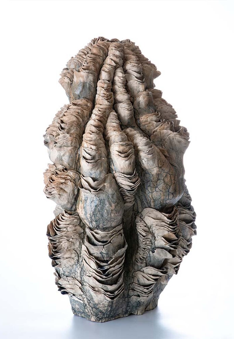 Born in 1992 in Aichi, Mio Yanaguchi belongs to the younger generation of female ceramicists. She studied art education at the Aichi University of Education after which she received further training at the Tajimi City Pottery Design and Technical Center. Her work shows her fascination with nature, especially the way repetition and clusters of elements can be found in natural designs such as beehives and corals. She does not imitate these, but draws strong inspiration from them. Mio Yanaguchi's sculptures are reminiscent of rock formations made of slate, with its repetitive layering of clay-rich sediments, such as clay shale. that have been transformed under high pressure over countless centuries. Each layer can be as thin as a sheet of paper, just as Mio Taniguchi's sculptures are composed of countless thin layers. For her, applying each layer one by one is a form of meditation. When she works on her objects, she feels at one with the material, and the final sculpture seems to be the result of this meditative state of consciousness. It also invites the viewer to a moment of reflection and meditation, as one does in "suiseki," the Japanese art of appreciating the beauty of a stone as it has been shaped by elements over centuries, with explicit appreciation for aspects such as stability, longevity and immortality. And Mio Yanaguchi herself also experiences her objects as such, when she sees the fingerprints in the surface and can see the traces of her existence in the clay because, as she herself says, her thoughts and emotions are absorbed into the clay and recorded in the object. Despite her still young age, Mio Yanaguchi has already received much appreciation for her sculptures. She was selected to exhibit at the 3rd KOGEI Triennial in Kanazawa, Ishikawa, the Hagi Grand Prix IV at the Hagi Uragami Museum and the 50th Women's Association of Ceramic Art Exhibition and the 11th International Ceramics Competition Mino, Gifu. Renowned galleries such as the Sokyo Gallery, Kyoto and Gallery SUKI, Aichi have also presented her beautiful works.